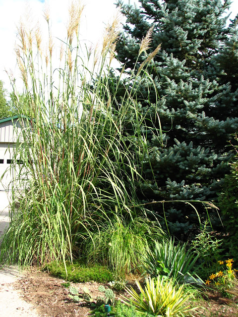 I think this is some form of a giant pampas grass... I just call it my twin towers as it stands guard to the entrance of my secret garden... there is also black eyed Susan in the right hand lower corner for those of you who think that ornamental grasses shouldn't be shown on fertilizer Friday...just wait till November .. they will still be there!